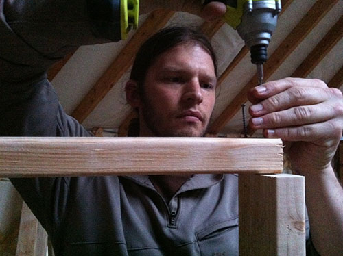 Just this afternoon, Evan put up all of the paneling we had stained with natural wood stain. We dissolved steel wool in vinegar and brushed it onto the rough cut, local lumber we had procured a few weeks ago. The interior wall of the loft looks fantastic (as seen in the first picture)! It looks even better than I had imagined it would.