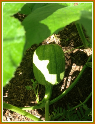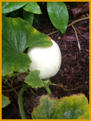 It’s not the first time I’ve tried to plant pumpkins, but this is the first year I’ve had success. Deer ate the baby pumpkins growing on my vines in years past, or the vines did not have enough room to spread. (I even heard of a man in Texas whose whole patch of pumpkins was eaten by very hungry coyotes)! This year, I planted the seeds directly in the ground in late May, this time in the front flower bed, where the vines could spread out and crawl up into some of the bushes. Pumpkin seeds and seedlings should be planted on little “mounds”, as opposed to flat on the ground. Pumpkins are in the squash family, so if I saw signs of blight, I sprayed the plants with a mixture of 1 cup water, 1 cup sour milk, and 2 TBSP baking soda.