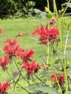 My favorite flowers to pop up in summer are my red bee balm blooms. They look like firecrackers, and are deer-resistant. This year they have drawn all sorts of colorful bees and birds, including a hummingbird moth and a ruby-throated hummingbird.