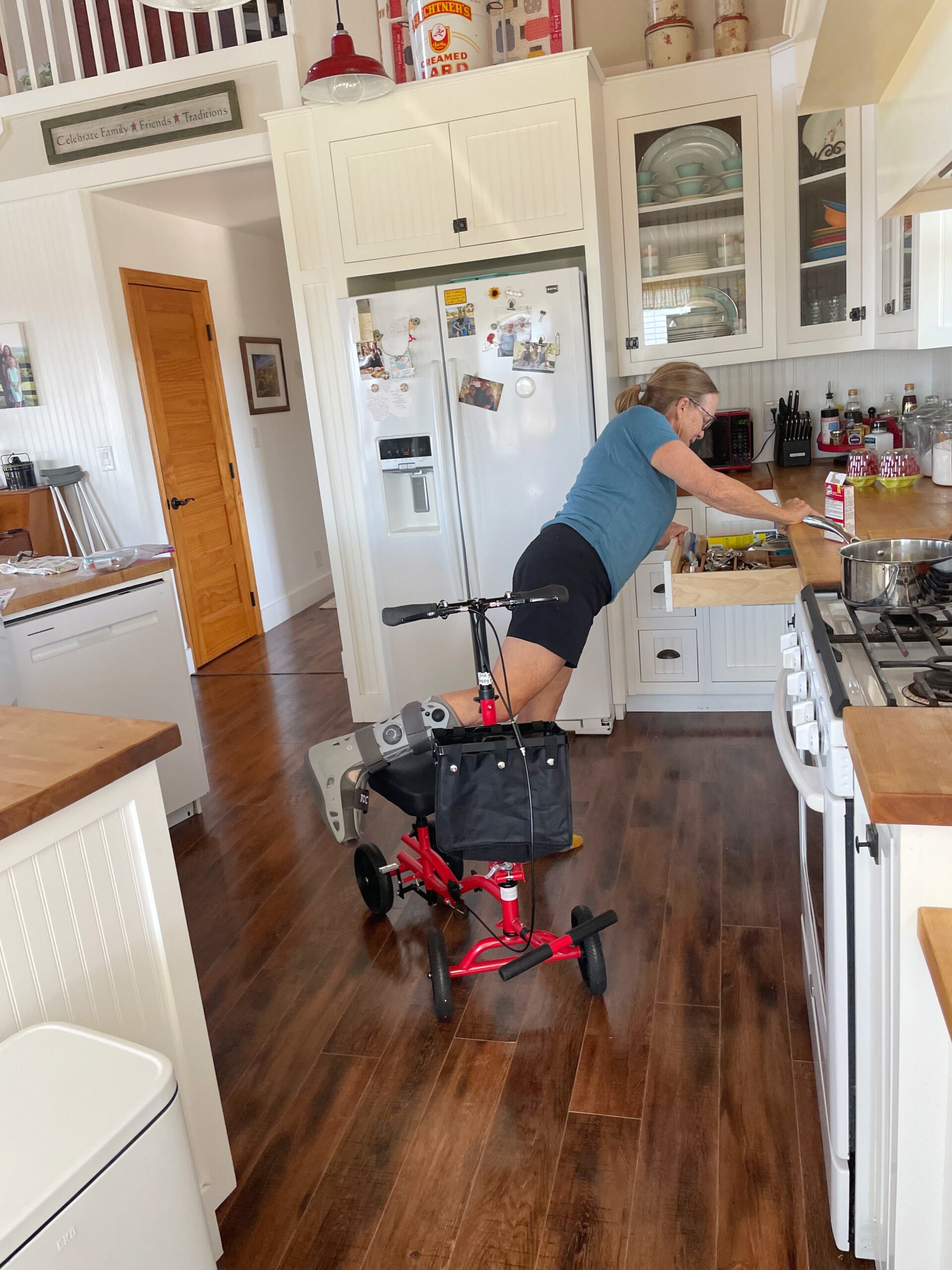 I’ve been able to (mostly) cook meals with one leg on the floor and the other on the scooter. And yes, I’ve fallen a few times. Those scooters are dangerous! My husband said “well, I don’t exactly think you are using it the way it’s intended”!