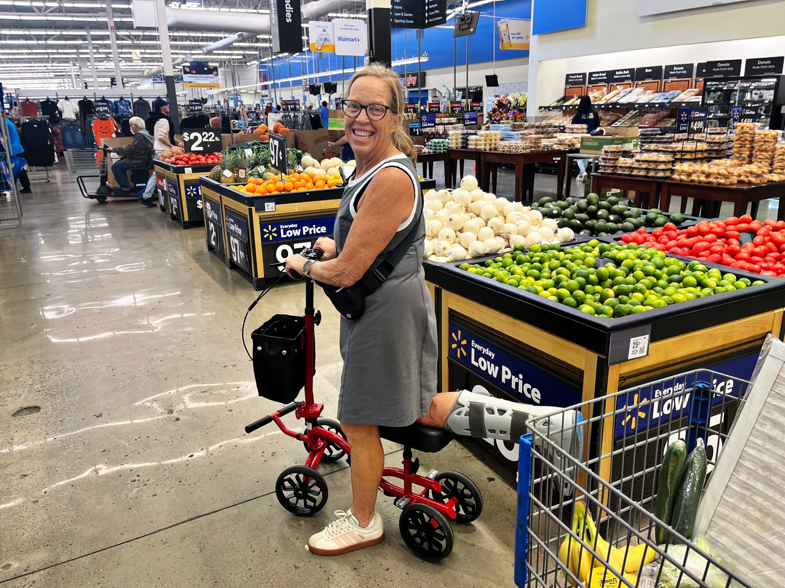 I have a knee scooter and right away I got really good at moving around on it. It has helped me immensely. My husband said when he took me to Walmart, he couldn’t keep up with me as he was pushing the grocery cart! (That isn’t exactly true, however! I did stop and wait for him! Smile!)