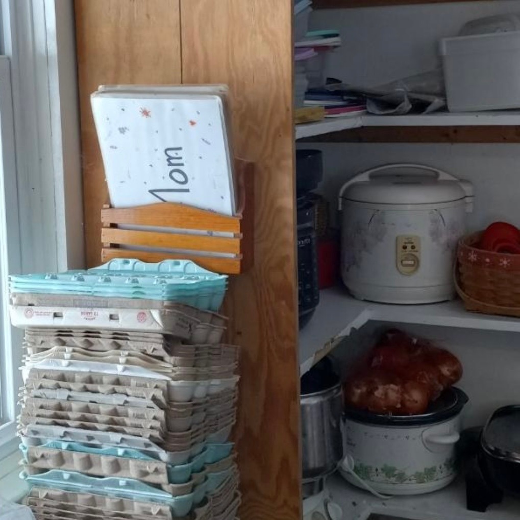 No room for a cupboard? No worries! Do you have an empty shelf in a closet, or how about adding some open shelving in the kitchen? Years ago I met a gal who pulled down old kitchen paneling, and instead of hanging drywall, she added shelves between the vertical wall studs…genius!