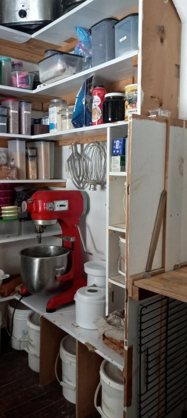 Shelves holding her bread mixer and wheat grinder share space with 5-gallon buckets of oats, flour, sugar, and wheat berries. (Look at that mixer – it’s fantastic!)