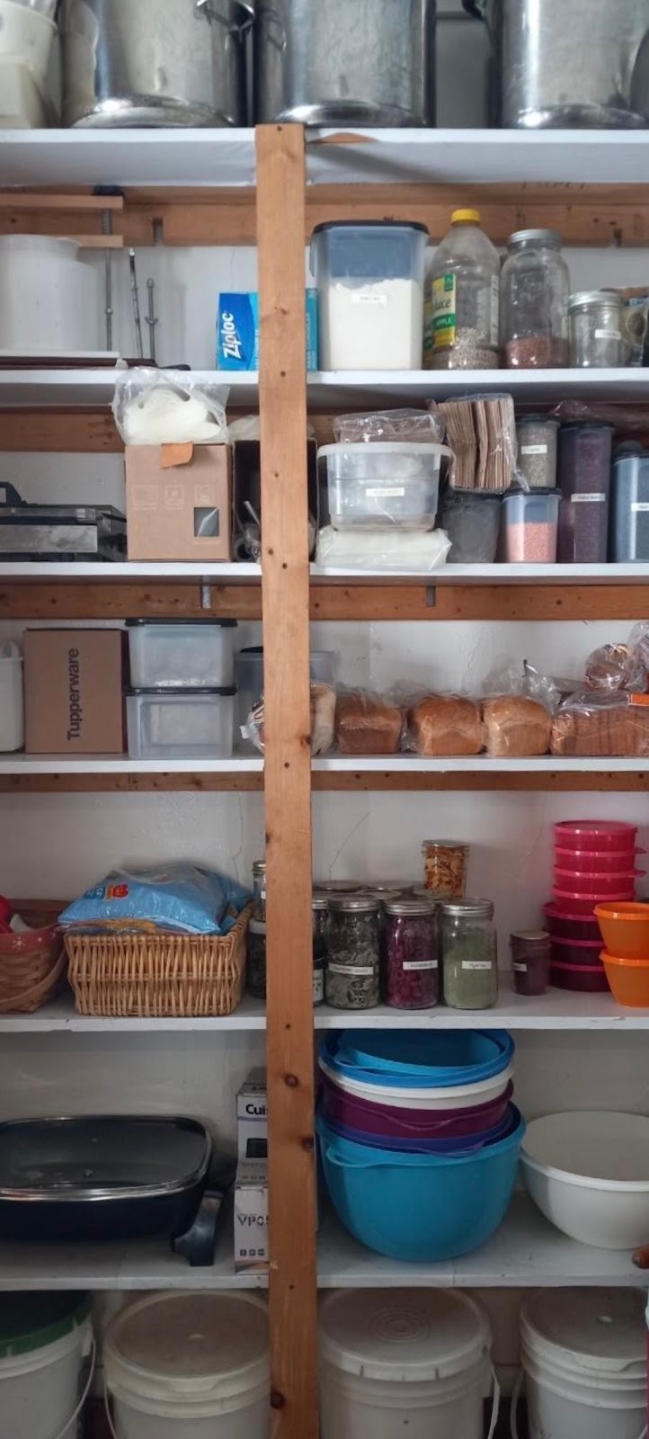 She created loads of room for potatoes, garlic, and onions alongside containers of rice, pasta, and beans. There’s even a spot for her husband’s chainsaws, “Why not?!” she laughingly asks. And I agree! When winds and ice bring down tree limbs, or branches block the paths leading to the barn and chicken coop, a chainsaw is right by the door ready to be put into action.
