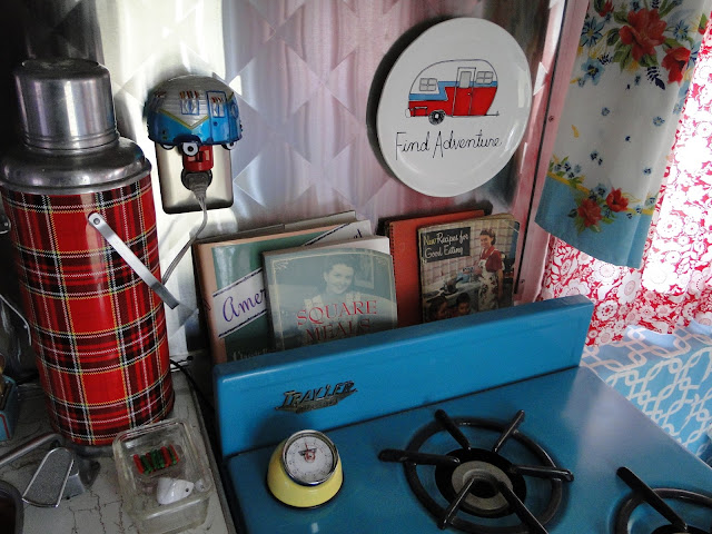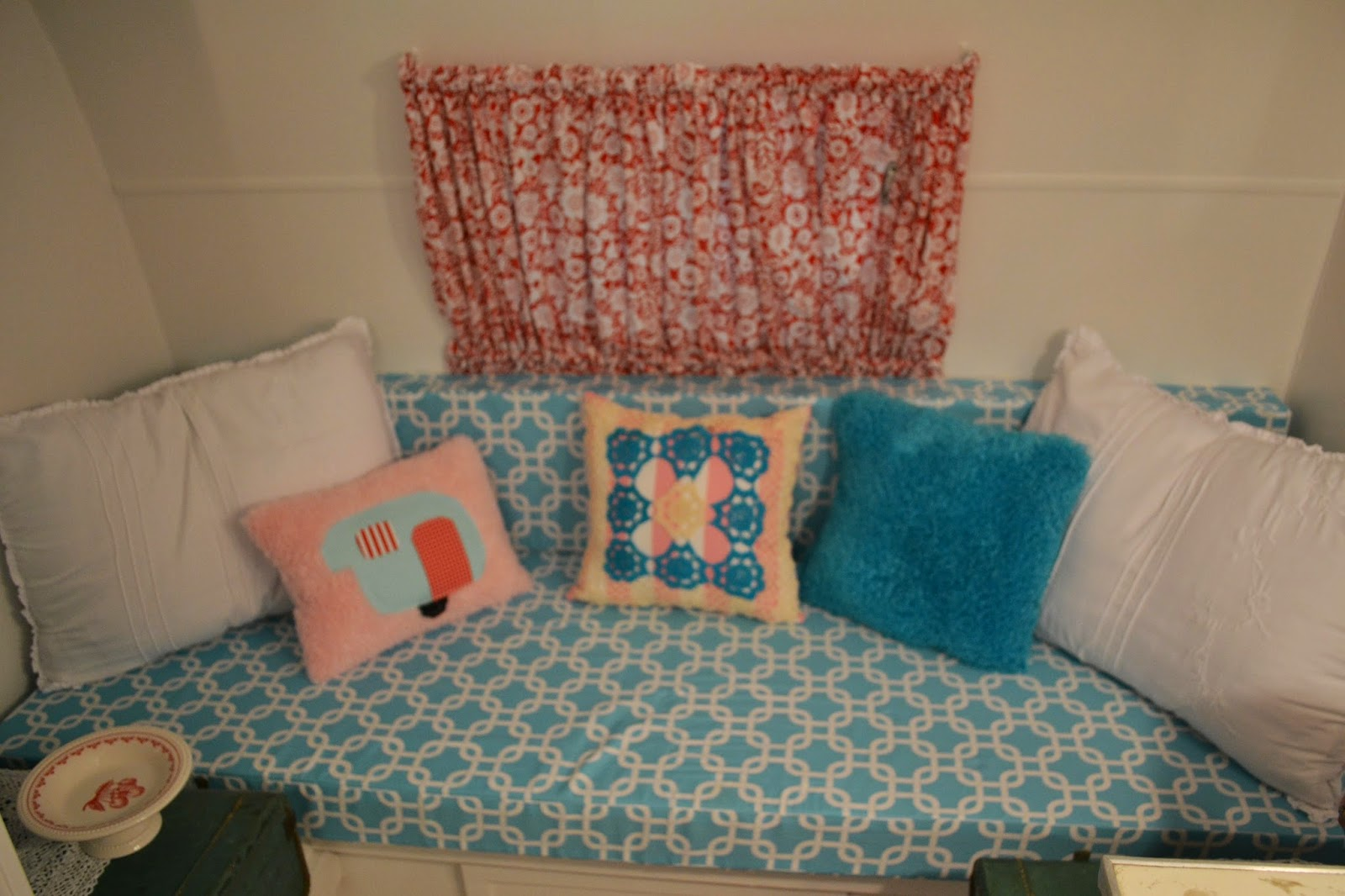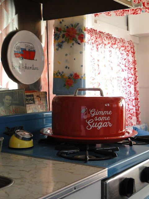 And you know what? Before long that that sweet little 13 foot 1963 Yellowstone Cab-over camper was sitting in my driveway. The first thing I did was unwrap and find the ideal spot inside to hang the sign telling me to “Never Stop Making Wishes.” While the turquoise blue wasn’t right for an 1864 home, it was perfect for a camper I named Maizy. I began to gussy her up with turquoise, cherry red and a bit of lightning-bug yellow and putting my own retro spin on her. And you know, for someone who loves antiques and primitives, who knew I had a surprising amount of vintage goodies tucked away just waiting for someday?