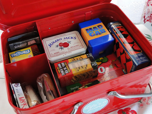 At a local feed store I found a pretty red picnic basket and filled it with mini games the kids had collected over the years…just right for a pint-size camper!