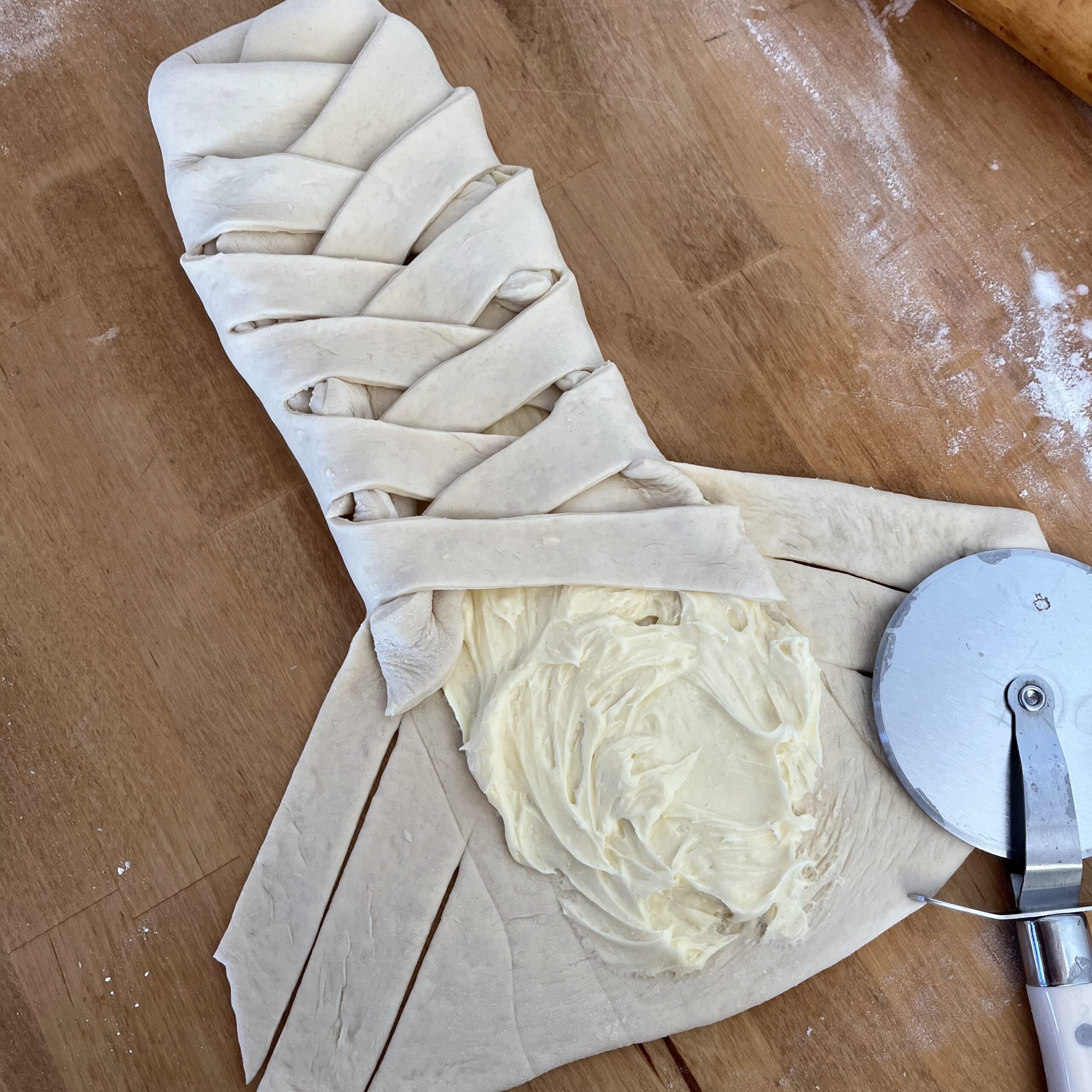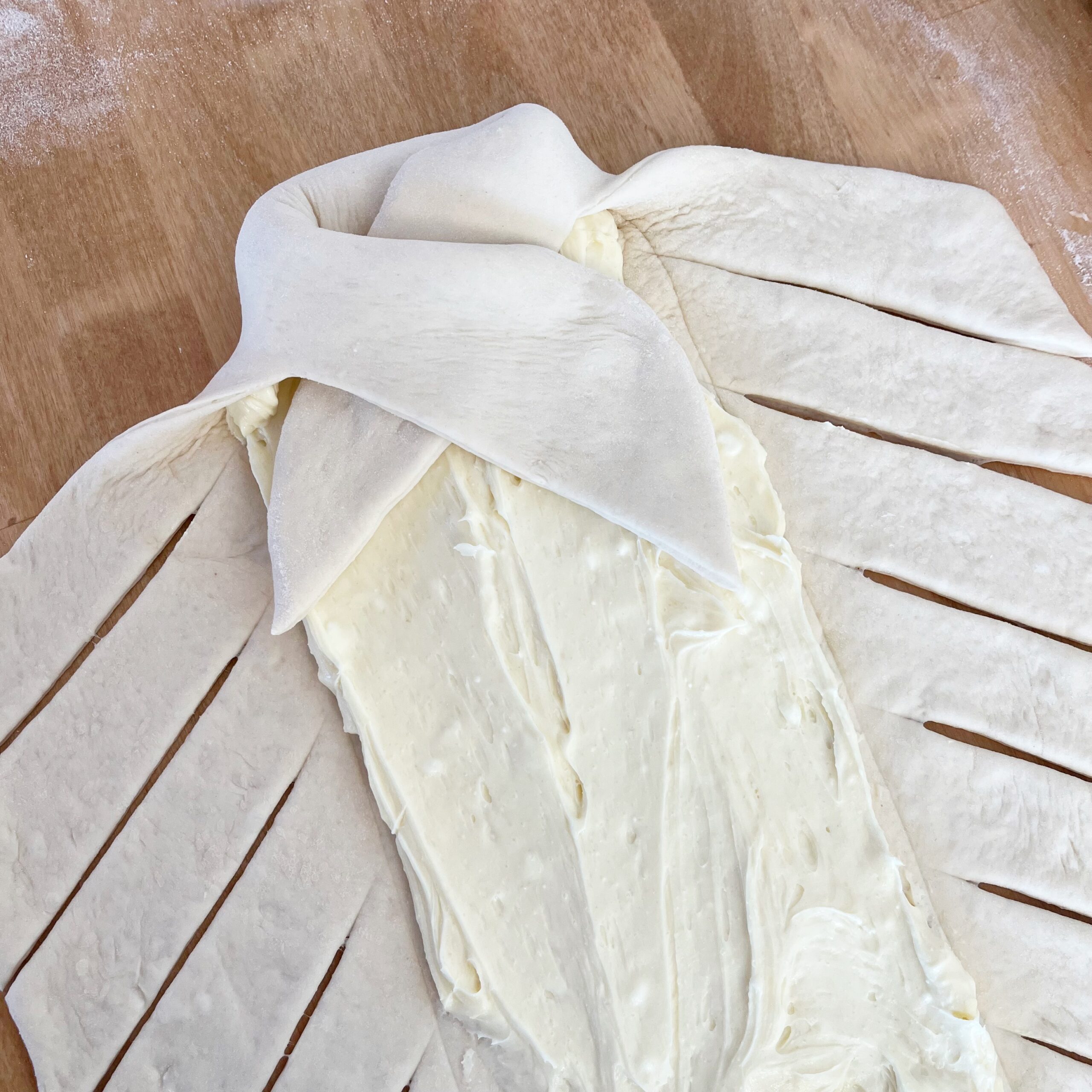 Now, this is where we start braiding. (And its not really a braid, more like a criss-cross fashion. ) Take the little middle section on the top and fold it down (kind of like the flap of an envelope) and then take a diagonal piece from each side and criss-cross over that. (The purpose of folding over that top flap is to keep the filling from spreading out when it cooks.)