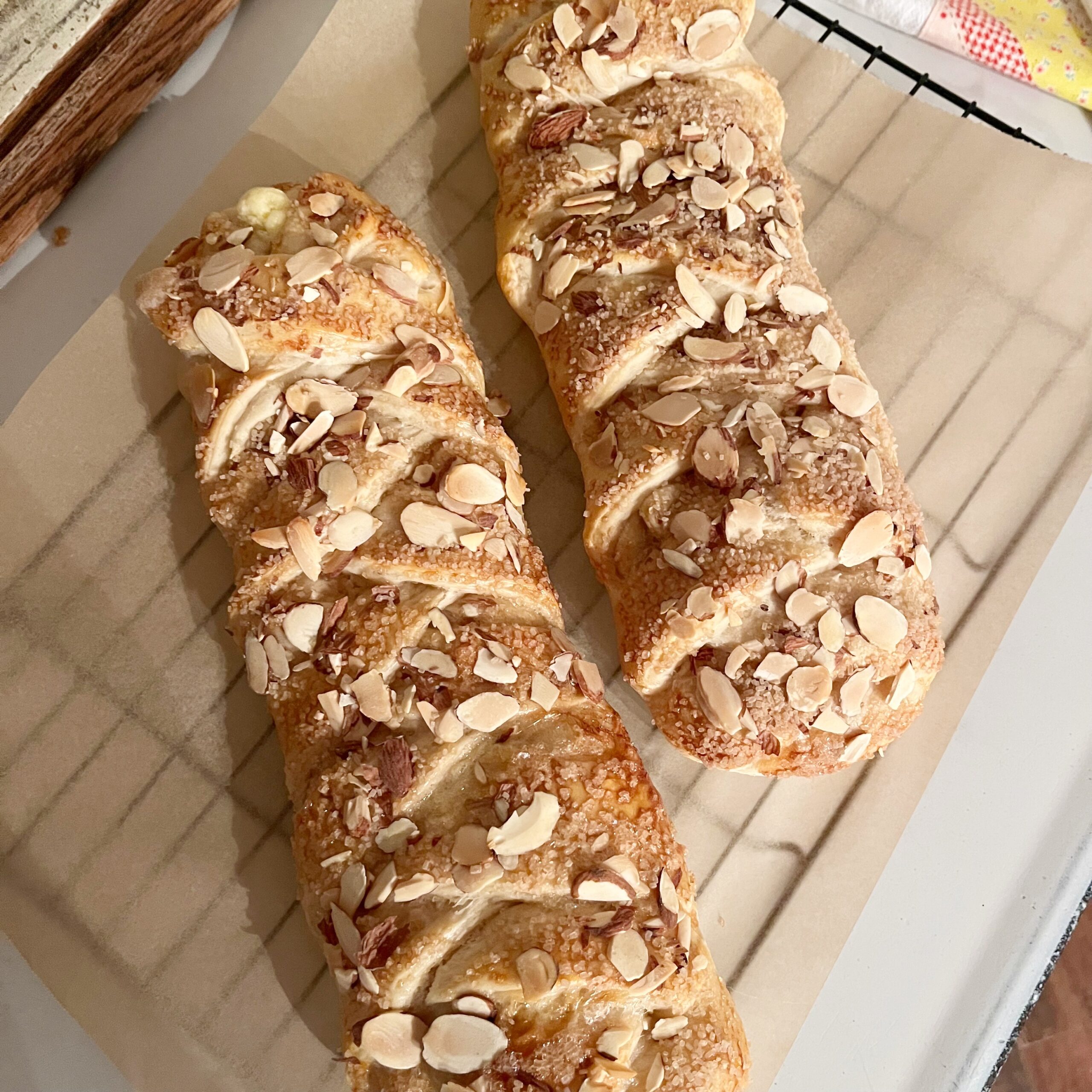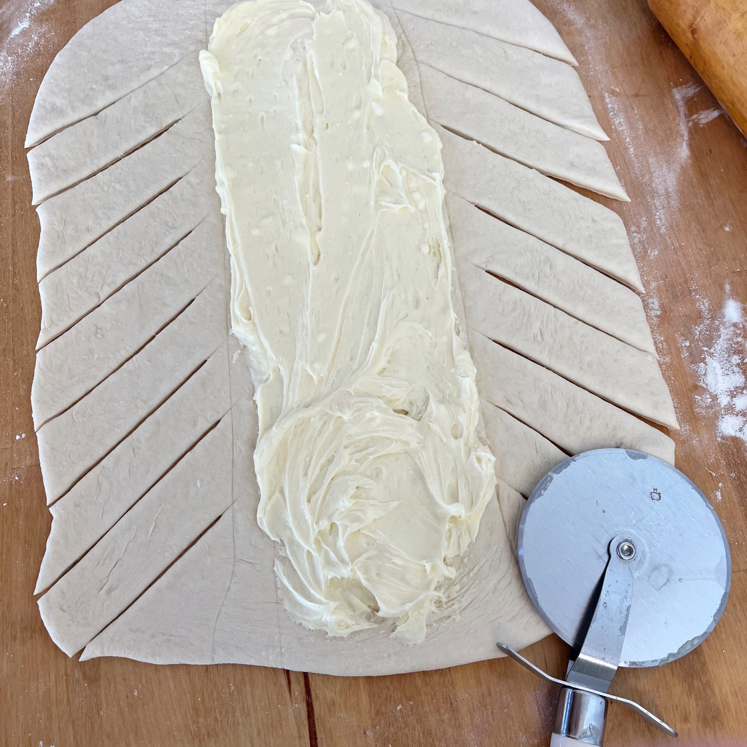 Place your almond filling in the center section stopping about an inch from the top and the bottom. Now, take your pizza cutter (or kitchen scissors) and cut your dough into 1 inch diagonal sections on each side, up to the scored lines. If your pizza cutter has a hard time cutting all the way through, you can also do this with kitchen scissors. It looks tricky, but it is very easy. Your diagonal sections do not need to be perfect either. All you really need to make sure of is that you have the same number on each side.