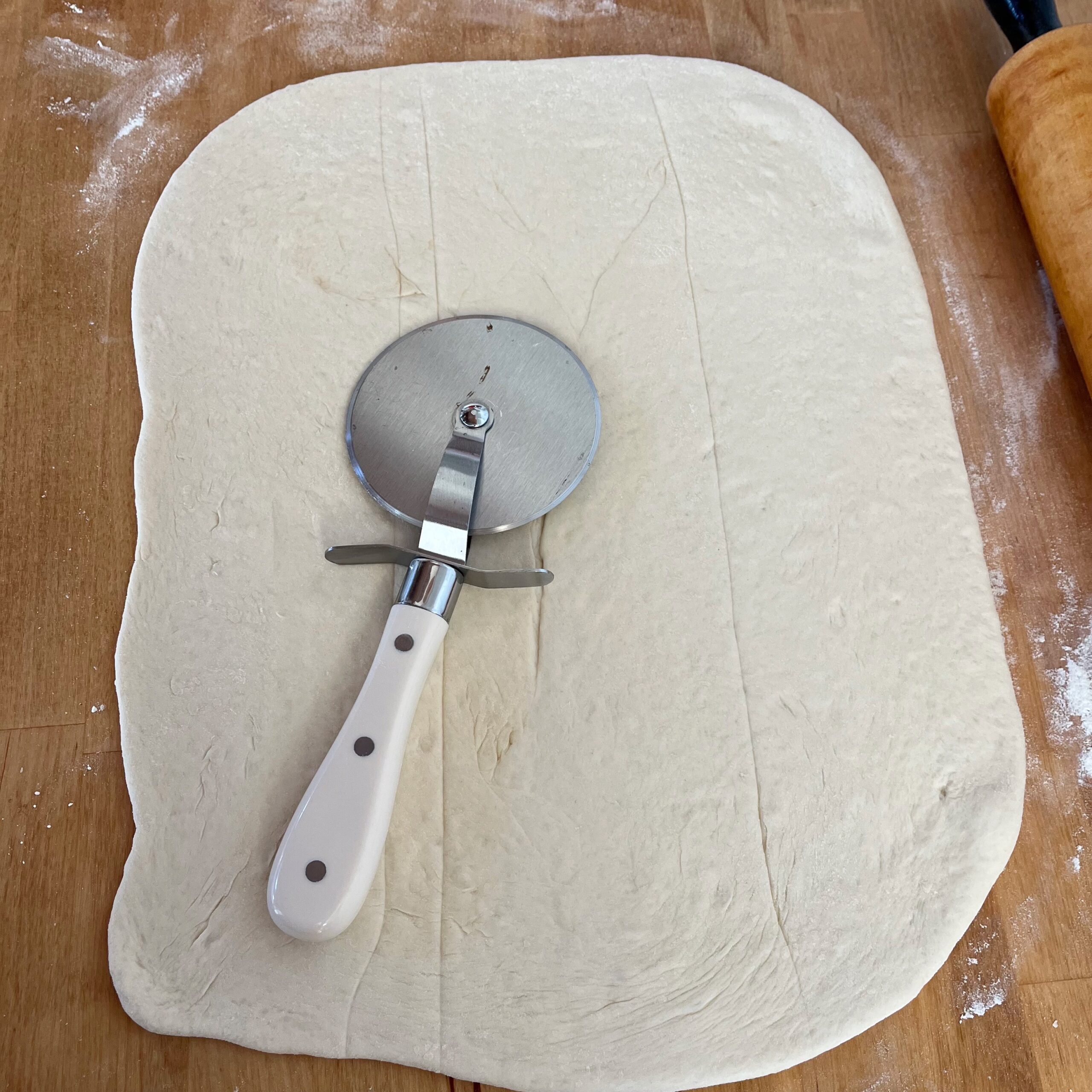 Using a pizza cutter, VERY lightly score your bread dough lengthwise into 3 equal portions. Do NOT cut through the dough, just lightly score it.