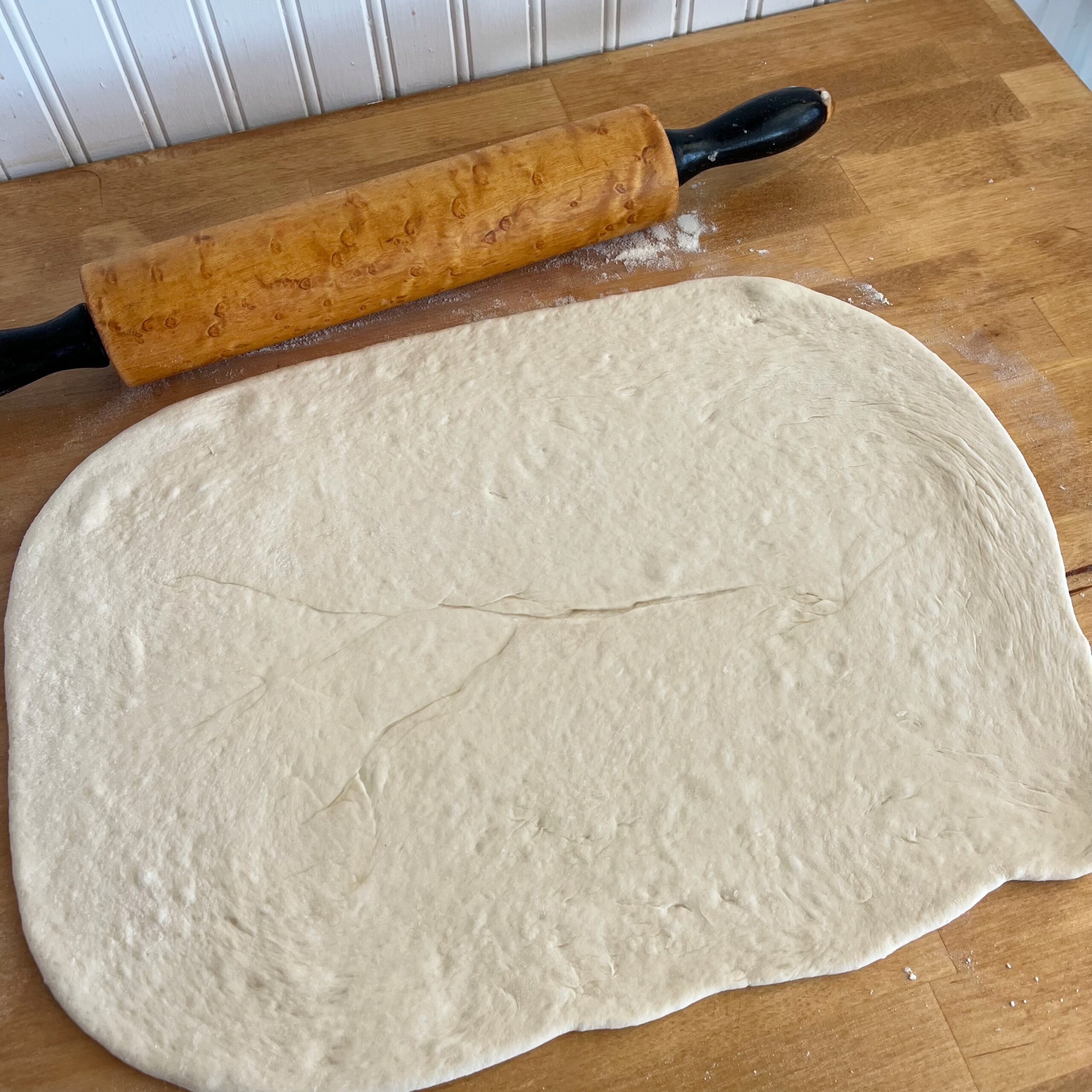 When your dough has risen, pour it out onto a floured surface and roll out your dough to a nice rectangle. Mine was about 9 inches wide by about 12 inches long. It does not have to be perfect.