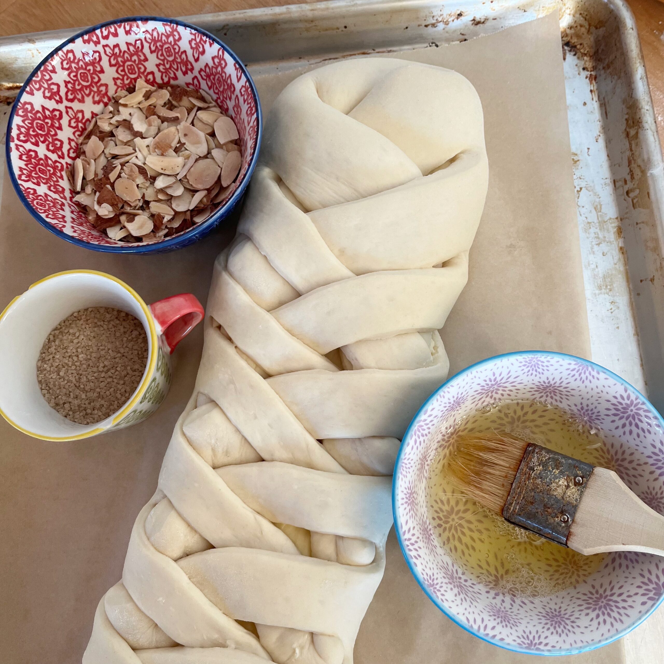 Now, take your reserved egg white and beat with a fork til foamy. Brush the egg white carefully all over the dough, covering every inch so it takes on a shiny appearance. Sprinkle with sliced almonds and raw sugar. (Or leave the almonds off. Don’t leave off the raw sugar though!!)