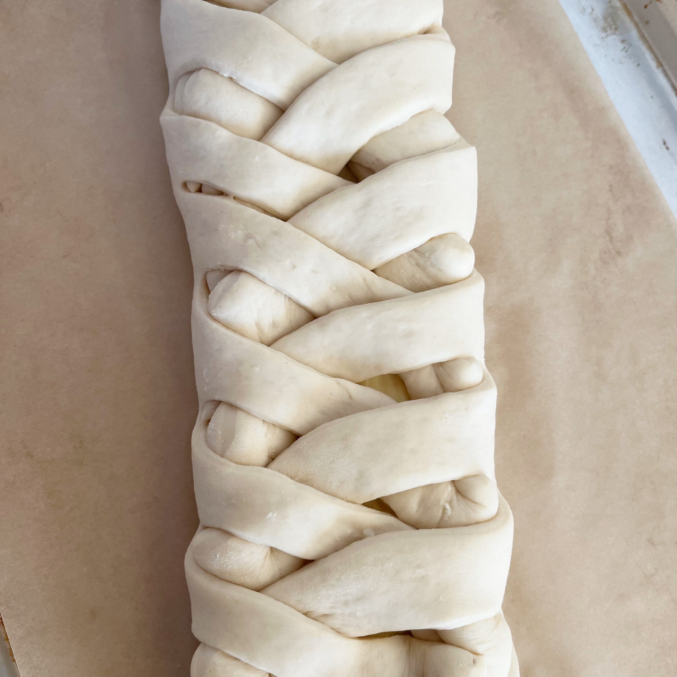 Your “braid” will look something like this. Cover it lightly with a tea towel and let it rise for 15 minutes or so.